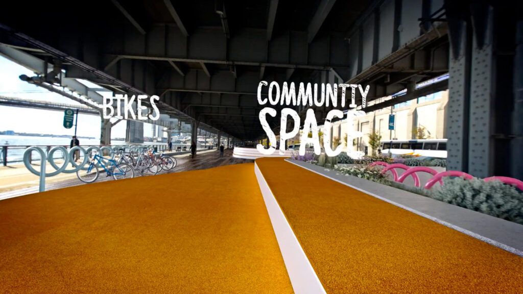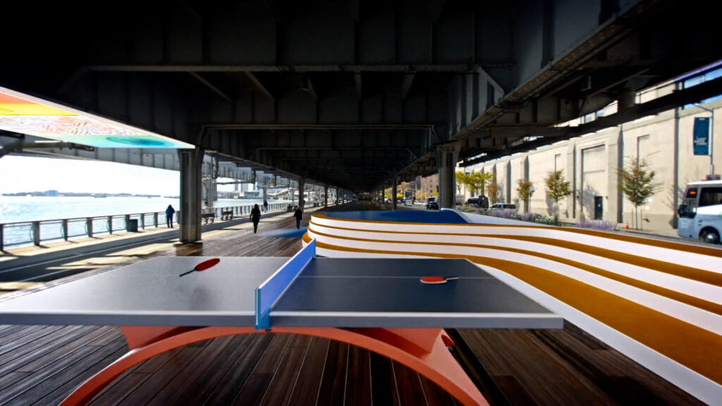 As they share these thoughts the environments around them begin to transform – far from being an obstructive wall, we see parks and trees, basketball courts and table tennis: the Dryline Park comes to life in the city. We blended these interviews with the designs to help audiences visualise the plans in a meaningful way.