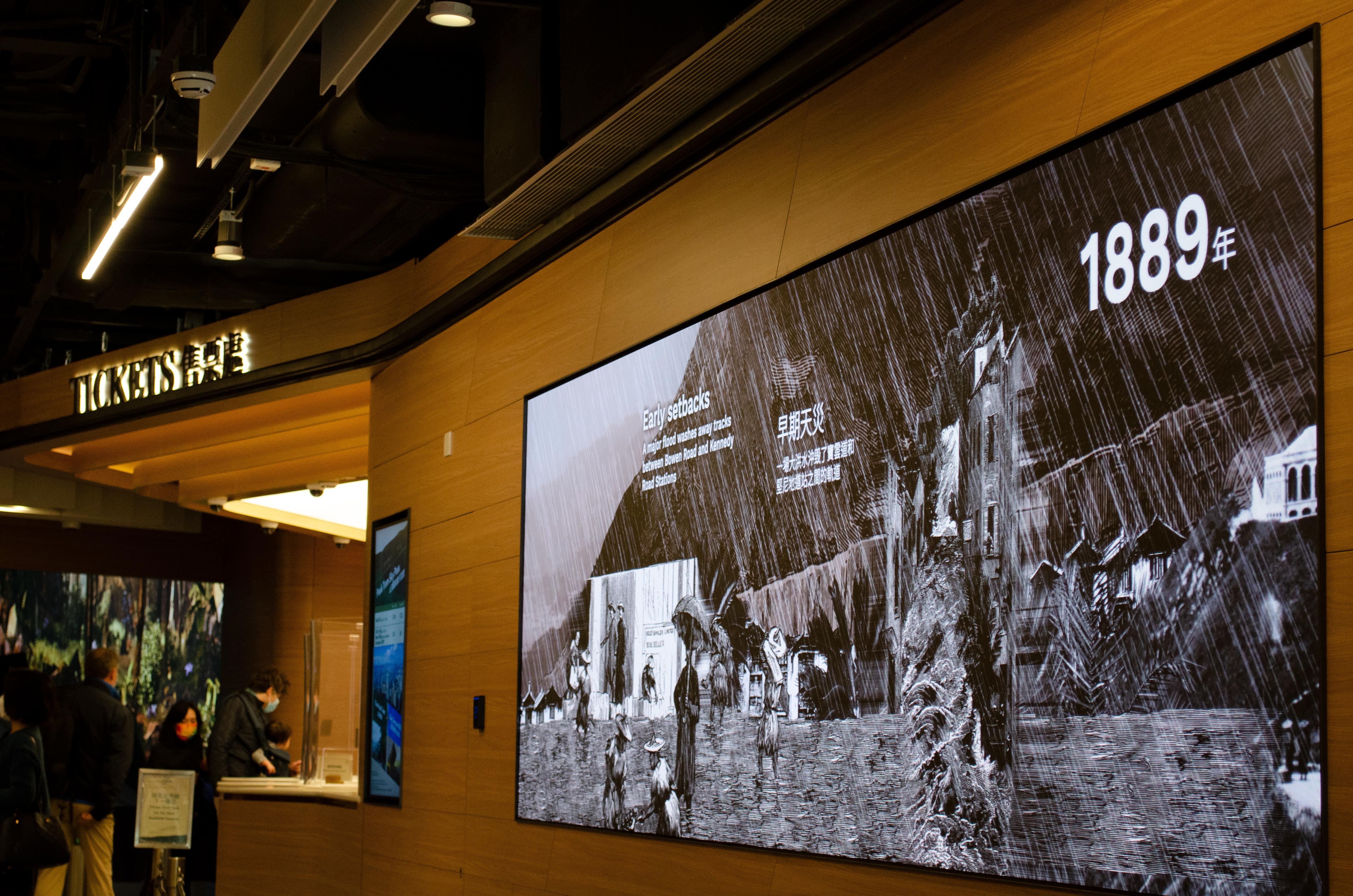 Once Upon a Tram – In the waiting area between the main entrance and the ticketing counters, a large AV installation displays a film, ‘Once Upon a Tram’ produced by Squint; which employs mixed media animation and archive footage to revisit key moments in the history of the Peak Tram. This digital timeline highlights social history, historical milestones and technological development from 1888 to the present day.