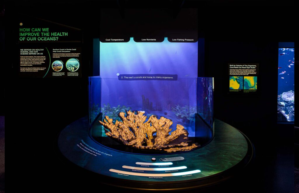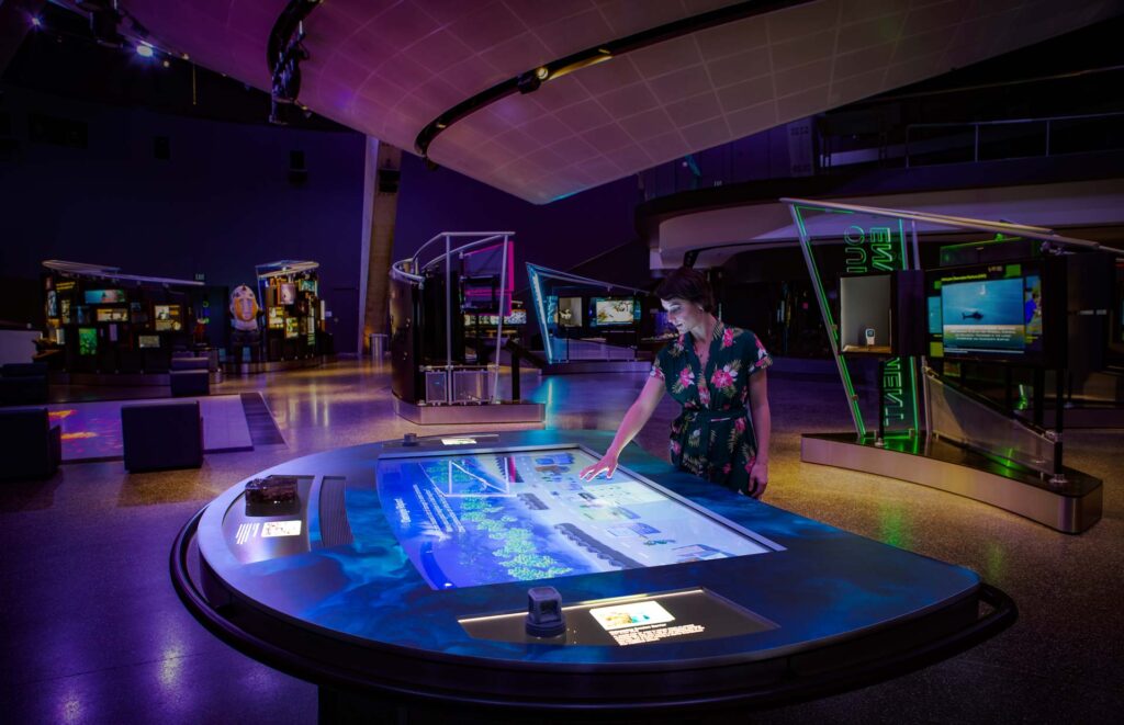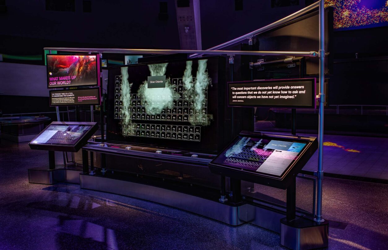 We created interactive games and exhibits that explore the power of science. At the centre of the exhibition space, we worked with Thinc Design to create a three-screen Periodic Table that features all 119 elements. With this digital interactive visitors can select multiple objects, such as the Sun and the Human Body, to see a 3D animation of the overlapping elements that make up both. Smaller monitors on either side invite individual exploration of each element of the Periodic Table. There are Easter Eggs hidden within the Periodic Table. Part of the Ocean display is a rare, preserved Elkhorn Coral specimen. To illustrate the life cycle of coral, we 3D scanned the specimen to projection map the various stages of healthy to dying coral. Visitors can toggle parameters in the ocean, such as temperature and nutrients, to see how this affects the coral’s health. Allowing visitors to explore the ways small changes in our oceans, like temperature rises, can impact the long-term health of these ecosystems.