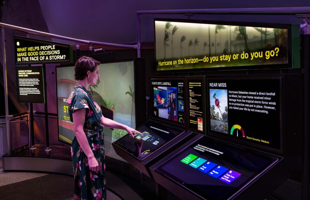 To illustrate the sometimes extreme weather of the region and the scientific research behind it we created several interactive experiences for visitors. Wild Weather is an augmented reality experience that places the visitor in the midst of a hurricane. Next to this experience is an interactive, multiplayer game for all ages centred around Hurricane Sebastian, a fictional hurricane, which is about to hit Miami’s shore. Players must decide whether to stay or evacuate, as a stream of information comes in from multiple sources and the risks constantly change: Twitter, texts from friends, weather reports, and more. Based on each player’s choices, they find out whether their house survived or not at the end.