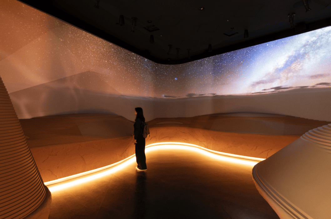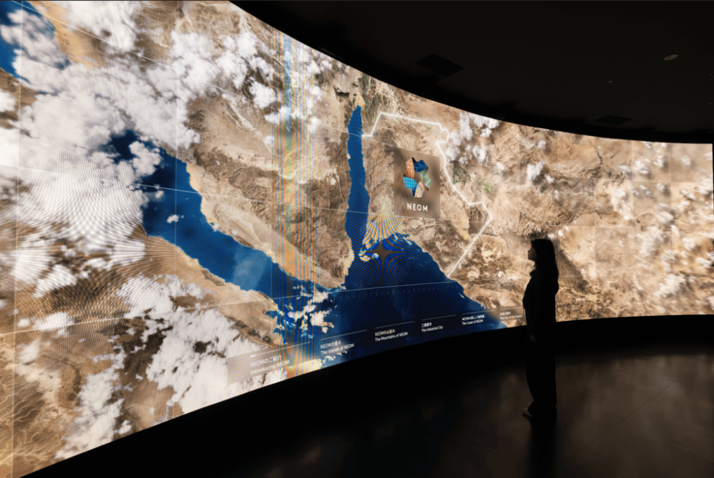 Pinnacle of Innovation is the final experience, highlighting the Kingdom’s future ambitions. An ‘innovation wall’ greets guests with a curated selection of physical and digital objects. Screens surrounding the objects bring them to life and attract visitors to explore the innovation stories behind them on interactive screens. An immersive screen highlights NEOM’s innovation at a local, regional and global level through rich satellite photography and an array of multimedia.
