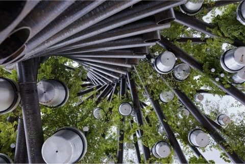 Constructed using reclaimed surplus steel, the sculpture features 350 British-grown saplings in spun aluminium pots set along its 80 branches. A wide team of welders, designers, fabricators, and arborists from across the UK collaborated to create this ecological monument.